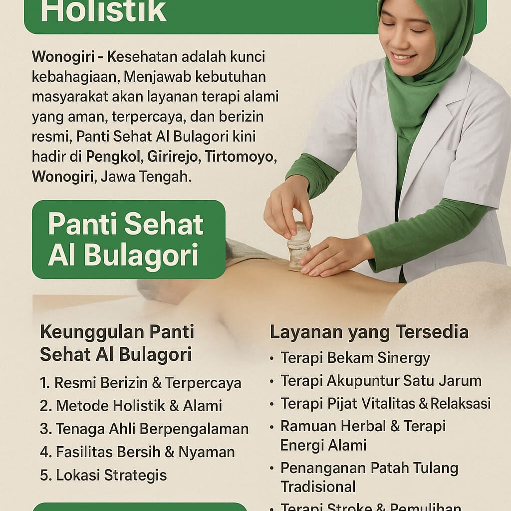 Kesehatan adalah anugerah terbesar dalam hidup. Saat tubuh terasa ringan, pikiran tenang, dan jiwa seimbang, hidup akan terasa lebih bahagia. Menjawab kebutuhan masyarakat akan layanan terapi alami yang aman dan terpercaya, Panti Sehat Al Bulagori hadir di Pengkol, Girirejo, Tirtomoyo, Wonogiri, Jawa Tengah.